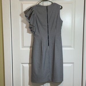 Banana Republic Elegant Navy and Tan checked asymmetric Ruffle Dress This elegant dress features a stylish ruffle detail, perfect for any occasion. Its classic design offers a timeless look. Fully lined. Zips up the back sleeveless with ruffle on left shoulder. Pet free smoke free home.