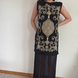Elevate your style with this stunning black dress featuring intricate gold embroidery, creating a sophisticated and timeless look. Perfect for any formal occasion.