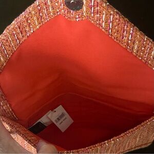 Interior has six credit cards pockets for organizing and storing your cards. Unique raffia materia. Button snap closure. Interior fabric lined. Brand new with tags.