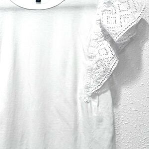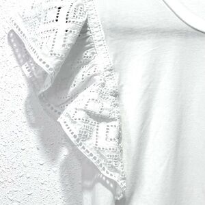 A white, short-sleeved top with a round neckline, featuring eyelet and ruffle details on the sleeves. Offering a comfortable and breathable feel, it is made from a lightweight cotton blend.