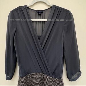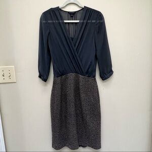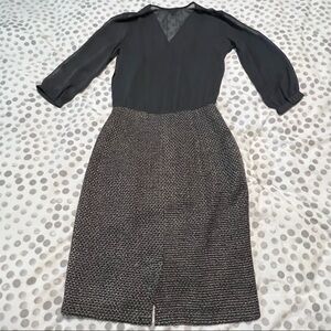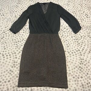 Just in time for Fall! Banana Republic Factory 3/4 Sheer top cocktail dress. Size 0. Top is sheer in a color that is represented of a dark sage green color. Skirt part is a wool and polyester material with tan and dark gray color with hints of shiny silver. An inner lining is under the entire dress. I am 5’4” and hits right above he knee as seen in the picture. Some snagging of material appears in the skirt. Can possibly be cut. Dress still in good condition otherwise.