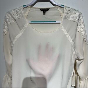 Chic cream blouse with lace accents on shoulders. Features flared 3/4 sleeves for added elegance.