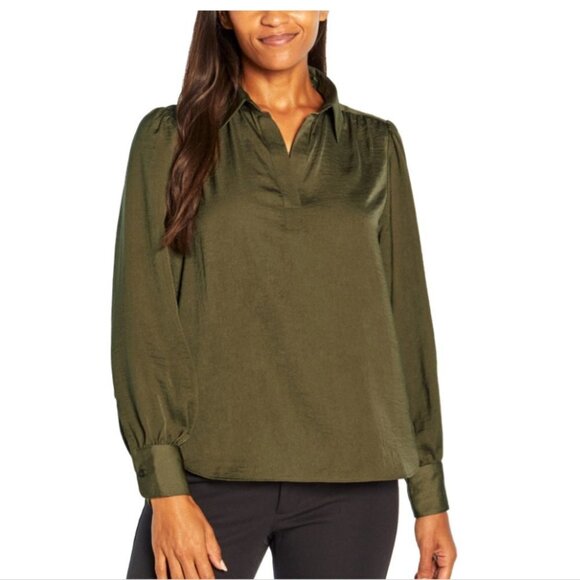 Chic deep green blouse. Features long sleeves and button cuffs. Versatile style.