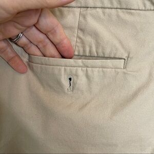 Classic design Banana Republic Factory tan/khaki walking shorts with hook/bar and button closure. Side pockets and back pockets with button closures. Excellent pre-owned condition. Size 2.