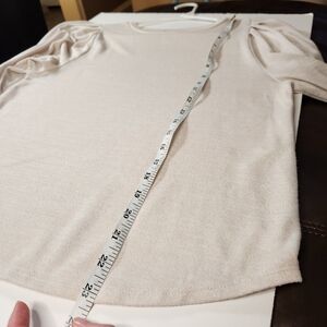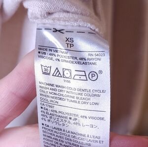 The cut on this long-sleeved shirt, made by Banana Republic Factory, is gorgeous. Pleating on the sleeves, cuffed wrist, and slight curve to the bottom hem. It would be a great workwear piece to pair with a skirt or trousers. You could also go casual with a pair of jeans.
