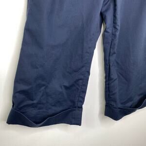 Navy blue stretch straight leg cropped pants. Hidden fly, rolled cuffs, pockets. Belt loops, stretch.