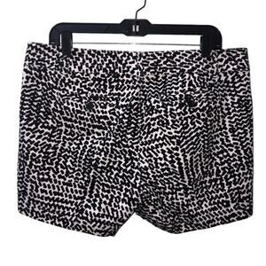Black and white geo confetti print shorts. Two front pork chop pockets. Two back faux pockets. Front zip and double hook and bar closure. Machine wash.
