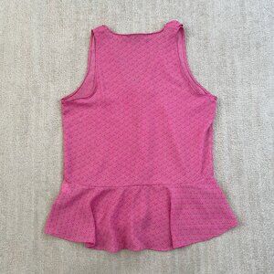 A pink printed tank blouse top with ruffle design in front and peplum panel in back