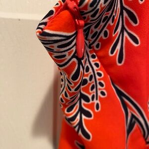 Coral color with a blue 70s vibe retro-inspired floral print.