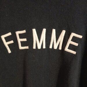 Features: lightweight, Long sleeves, Crew neck, Embroidered FEMME across chest, ribbed cuffs and hem