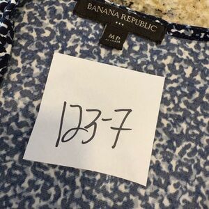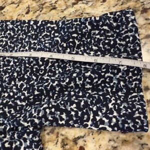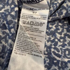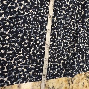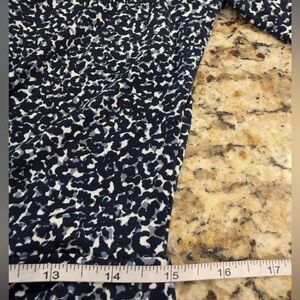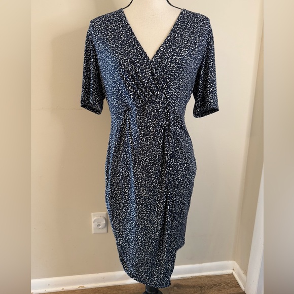 Banana Republic Factory mock wrap midi dress in an abstract navy blue, light blue and white pattern, V neck, short sleeves, and a super soft polyester spandex blend. SZ MP.