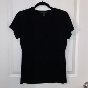Size M fitted black scoop neck tee from Banana Republic. Thicker material. Texture pictured. Love this top, it's a staple! Unfortunately I just don't reach for it anymore.