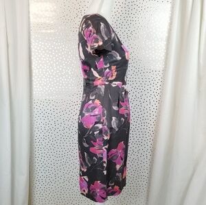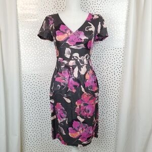 Banana Republic floral short sleeve v-neck sheath dress in gray with purple and pink flowers. Size 0. Shell: 67% Rayon, 33% Linen. Lining: 100% Acetate.