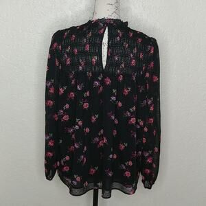 Banana Republic floral blouse with sheer sleeves and sheer panel at the top. Hook and eye closure at the nape. Size S.