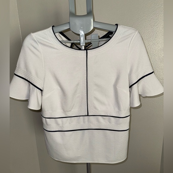 This Banana Republic blouse is a white top with navy blue trim detailing along the neckline, sleeves, and waist. It features short, ruffled "flutter" sleeves and a keyhole opening with a tie detail at the back. Perfect for any occasion.