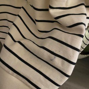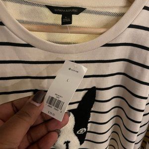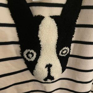 Terry crew neck shirt with vertical stripes and adorable French Bulldog embroidery. Unworn and unwashed with tiny stain.