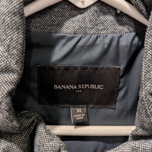The Banana Republic Full Zip Quilted Vest is a men's clothing item made of a cotton blend outer shell material in charcoal grey color. It features a full zip closure and quilted accents. The vest has a regular fit and is available in size M. It is suitable for winter, fall, and spring seasons.