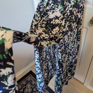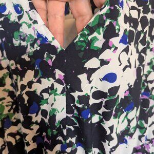 - Print: A painterly floral in shades of blue, purple, green, and white on a black base—evokes tropical dusk, not garden cliché.