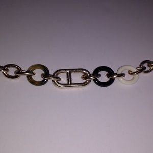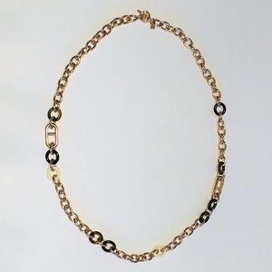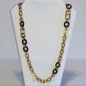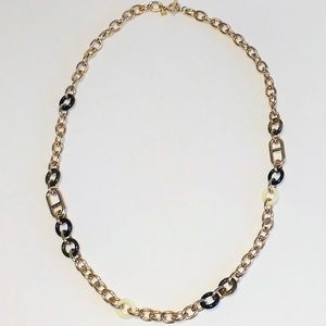 A classic gold link necklace by Banana Republic with green tortoise, ivory & black links combined. Since it has both cool & warm colors, it is literally a great necklace for just about anyone who can pull off the heft. This costume necklace was created with a toggle clasp, it is easy to put on or take off yourself or you can simply put it on over your head. In great condition with the BR brand stamp and only minor indentations/discoloration/tarnish. Both front and back shown, please see pics. 👄