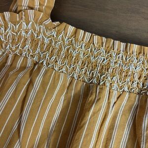 This sleeveless top from Banana Republic features a vibrant gold hue and a stylish smocked design on the wide straps. The ruffled details add a touch of elegance, making it perfect for a casual, summery look. Crafted from a light and airy fabric, it offers a comfortable and breathable fit.