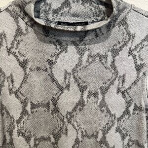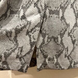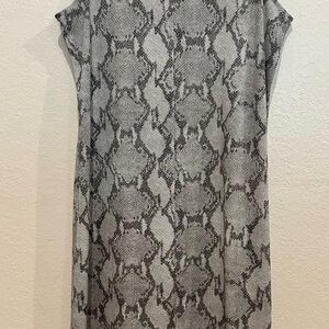 This Banana Republic dress features a sophisticated gray snakeskin pattern, perfect for casual or work settings. The sleeveless design with a crew neck and dolman sleeves offers a modern twist on the classic sheath style. Its midi length and smooth fabric ensure a flattering fit and comfortable wear.