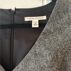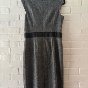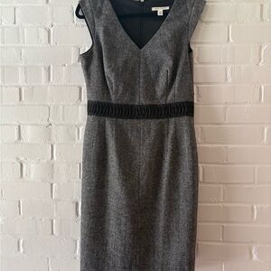 This Banana Republic dress showcases a sleek sheath style in a refined gray and black color scheme. The sleeveless design and V-neckline add a touch of elegance, while the black waistband enhances the silhouette. Ideal for work or cocktail events, this midi dress offers both sophistication and versatility.