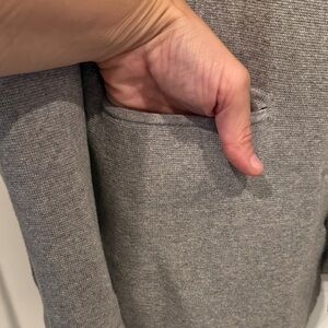Chic gray suit knit open front jacket. Perfect for work or casual wear. Timeless style. Useful pockets, open collar and open front style. Hits at hip. Stretchy and warm. In EUC.