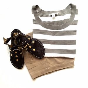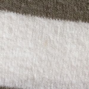 Lightweight cotton top with olive green and white stripes. Very faint spot on front (shown). Easy piece to throw on with jeans or shorts.