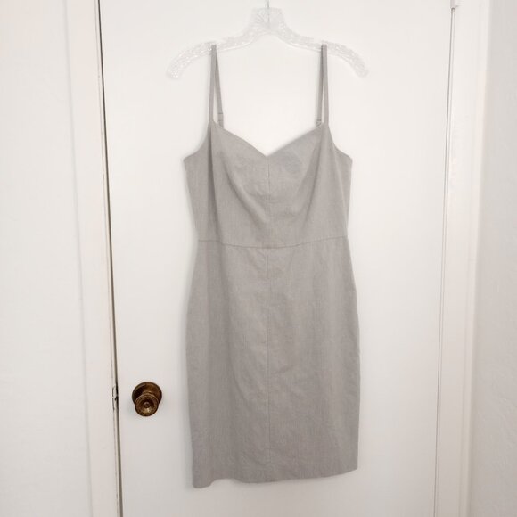 Banana Republic Grey Stretch Sheath Spaghetti Strap Dress, adjustable straps, lined bodice, rear zipper. Classic career dress for work office, just add a cute cardigan. Sheath style silhouette and fabric has some stretch.