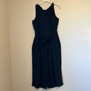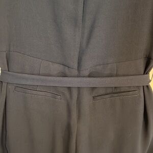 Pre owned good condition has a pull on back of leg but super noticeable this a wide leg flowy jumpsuit belted and slightly pleated zip and button in the back