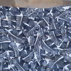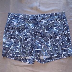 Banana Republic 3.5” mid-rise shorts with a navy blue banana leaf palm frond pattern on a white background. Some stretch. Excellent condition. Approximate measurements in photos.
