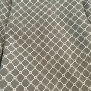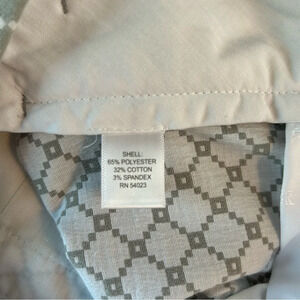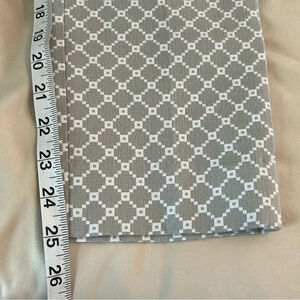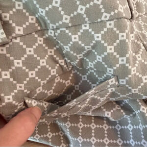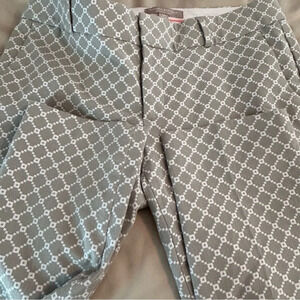 Gray and white geometric print cropped dress pants. Has slash pockets in front and faux pockets in back. Hook and eye, button closure with zipper. Made of 65% polyester, 32% cotton and 3% spandex.