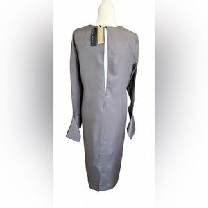 With its sleek sheath silhouette and midi length, this dress flatters the figure with a tailored fit through the chest, waist, and hips. The crew neckline features peekaboo cutouts at both the front and back for subtle sophistication, while the long sleeves with three-button cuffs add polish. A center-back vent ensures movement and comfort, making it perfect for both professional and elegant evening occasions.