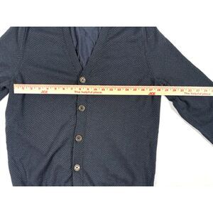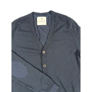 Add timeless style to your wardrobe with this Banana Republic Heritage men’s wool cardigan in size medium. Designed in a rich navy blue herringbone knit, this piece combines refined style with cozy comfort. Featuring elbow patches for a classic touch and a button-front closure, it’s perfect for layering at the office, casual outings, or evening wear.