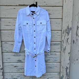 Dress is white. Fabric belt is included, leather belt is NOT included.