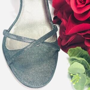 🪲 Banana Republic High Heel Sandal Size 6 Silver Shimmery 100% Leather Strappy Crisscross Buckle Closure