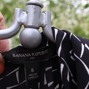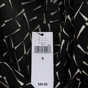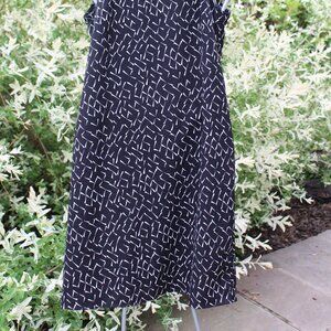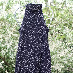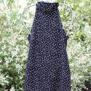 High neck tie sleeveless black dress with white criss cross pattern. Zip up back ties behind neck.