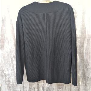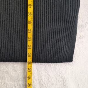 Luxuriously soft black tunic sweater crafted from an Italian wool-cashmere blend by Banana Republic. The fine gauge, vertical rib-knit texture adds a subtle depth and visual interest to the deep, solid black color. This piece features a modern V-neckline with a crossover collar detail, offering a clean, polished look.