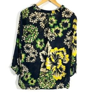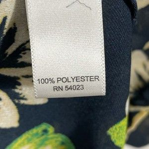 Banana Republic semi sheer blouse in navy with green and yellow floral design.