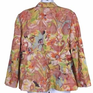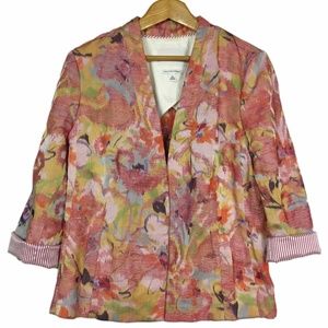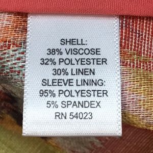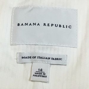 Open front jacquard flower jacket or blazer made of Italian fabric by Banana Republic. Not lined except for the sleeves which have a striped, satiny polyester lining. No visible flaws. All measurements are taken flat and are approximate. NWOT