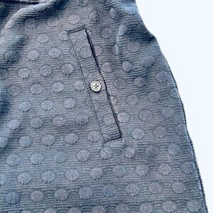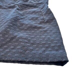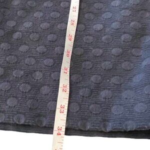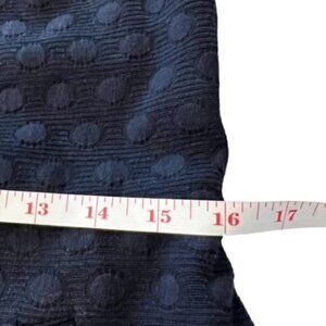 Beautiful polka dot jacquard fabric, navy blue. Front button pockets. Back zip up with eye and hook. Sleeveless and fully lined. Put a turtleneck under this with a pair of tights and you can wear this during the winter until it gets warmer and then go sleeveless.