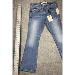 Style: Crop Flare, light wash denim, subtle fading, modern flared leg