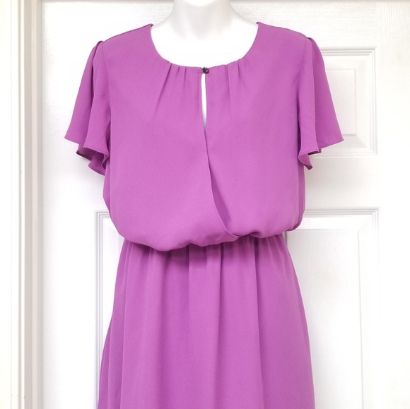 Flutter dress with keyhole neckline pockets and elastic waist. Hits right above the knee.