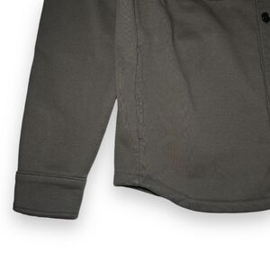 It's a workshirt/chore shirt style with a smooth jersey exterior and a cozy terry cloth interior, making it a perfect layering piece. The color is a solid, dark green/olive. It features a button-front closure, two button-flap chest pockets, two convenient side seam pockets, and two interior patch pockets for extra storage. This versatile shirt can be worn as a jacket or a heavy shirt.