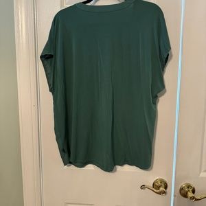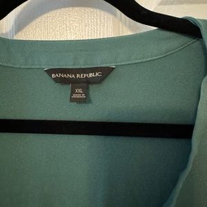 Banana Republic® Colors: Green (Green/Blue Spruce) Relaxed fit with banded v-neckline Woven front with jersey back Dolman cap sleeves Shirred detailing at shoulders Centered pleat accent Content: Front: 100% Recycled Polyester Back: 95% Rayon | 5% Spandex Approximately 165 GSM Lightweight