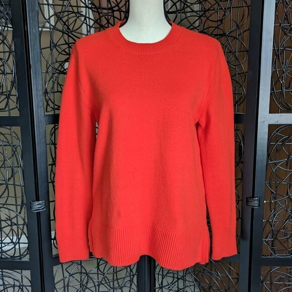 This bold knit sweater features a crew neckline, boxy fit, side vents and a slightly longer back hemline. Item has no damage or wear.