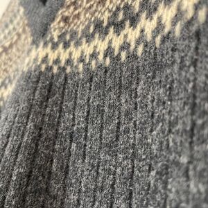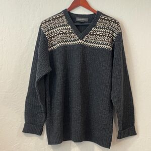 Originally $150; hard to find. Warm, cozy 100% lambswool Banana Republic sweater in men's size large / L / lg. Gorgeous charcoal / deep grey gray body with aribbed texture, chest pattern in gray, brown, tan. V-neck neckline. Comfortable and soft, for all-day comfort. Perfect fall or winter sweater for on the slopes, at work / office, for everyday errands, or cozy relaxing at home or on vacation. Beautiful neutral color palette goes with everything! Looks great with jeans or dress it up with slacks and a blazer for work meetings or nights out.