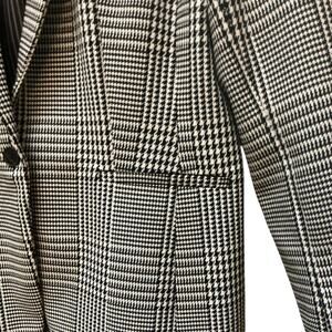 Banana Republic Long & Lean classic black and white houndstooth pattern blazer with BR navy striped lining. The Long & Lean blazer is a stylish and versatile piece for both casual and business occasions. This blazer features a long length, long sleeves, and a one-button closure. Made from a blend of polyester, rayon/viscose, and spandex, this blazer offers a comfortable and flattering fit. The houndstooth pattern adds a touch of sophistication, while the lined interior ensures a polished finish. Perfect for the woman looking to elevate her wardrobe with a classic and timeless piece from Banana Republic.