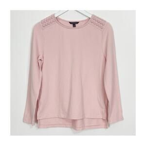 Light pink, knit top in 100% cotton. Round stud embellishments on shoulders. High low hem with side slits.
