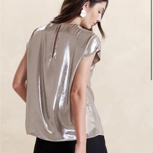 Elevate your wardrobe with this Banana Republic blouse, featuring a luxurious champagne gold metallic finish. The oversized, relaxed fit and cap sleeves offer a chic and comfortable style, perfect for both casual and dressy occasions. Its fluid fabric drapes beautifully, adding a touch of elegance to any outfit. Dress up with slacks or skirt, or down with jeans.